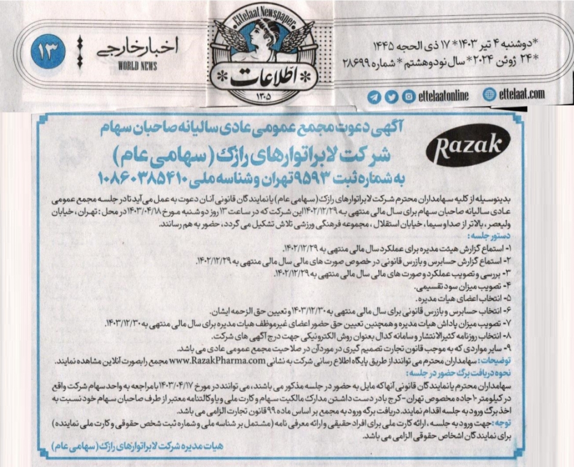 آگهی دعوت به مجمع عمومی عادی سالیانه صاحبان سهام - RazakPharma.com